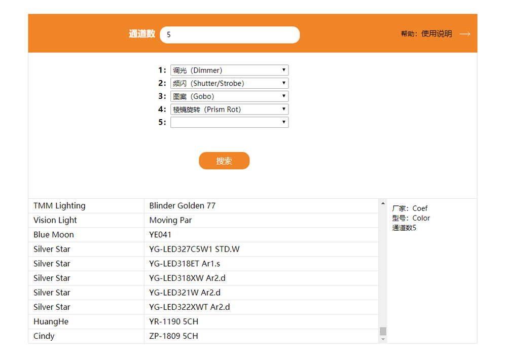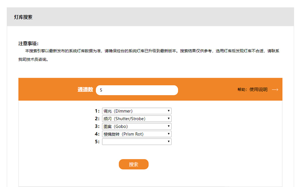 根据灯具的通道表输入“通道数”,并选填部分或全部的通道资料,然后点击“搜索”按键,轻松几步就能快速找到合适的系统灯库。