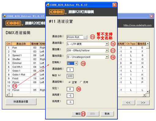 "快速通道设置"界面可选择中英文显示模式,但是这并不意味着生成的灯库文件也会显示为中文,因为R20文件暂时还不支持中文字体,中英文显示模式只是为了照顾不懂英文单词的用户,使得大家在编辑通道时能够方便一些。